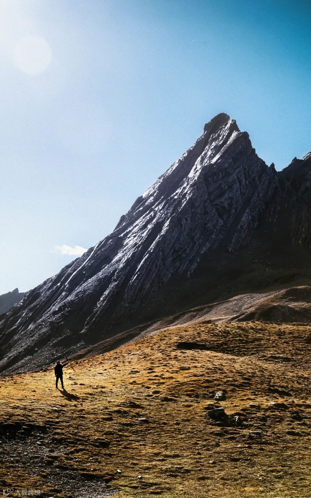 攀上高山,远处的队友也刚好翻过山头来到面前的平地,他冲我喊了一声,手臂举起伸向旁边的高山,我立刻心领神会,举起相机,用尼克尔 Z 24-200mm f/4-6.3 VR的中焦段抓拍下队友与远山的合影,让寂静的山谷也多了几分人文的色彩;正巧有阳光从左上方进入镜头,为画面增加了暖意的视觉氛围感。