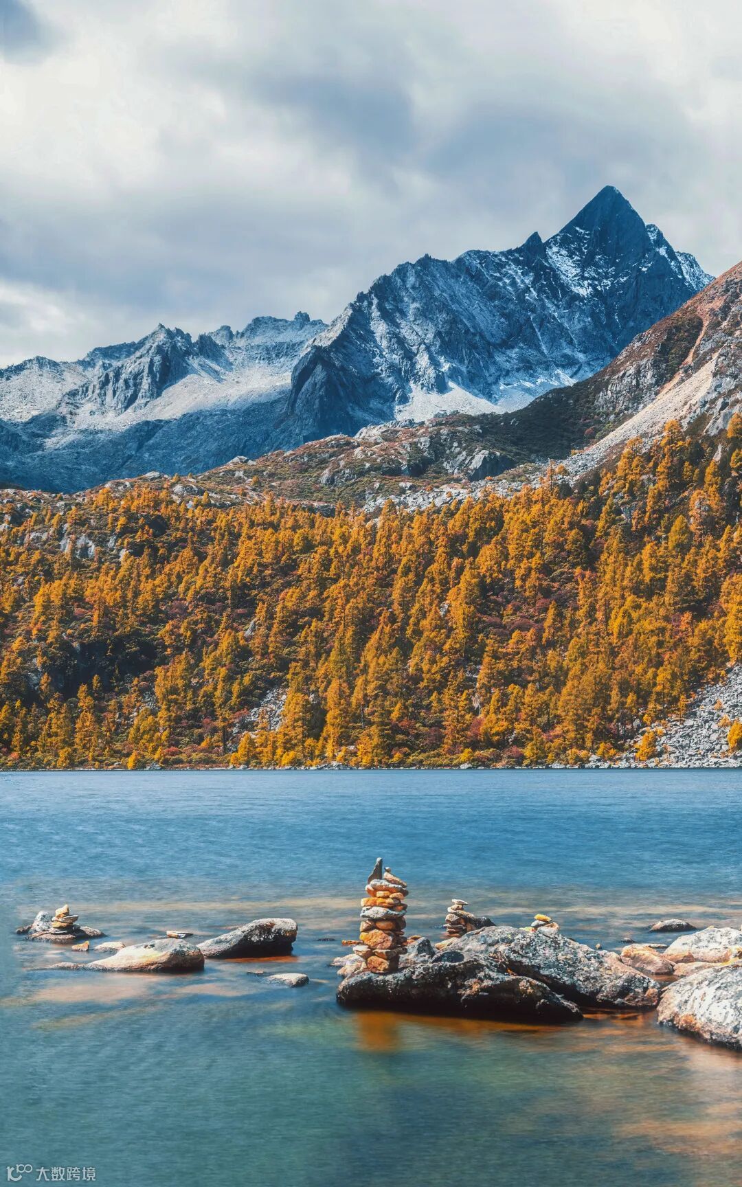 川西葫芦海边,不知是哪位有趣的游客“塑造”的石碓吸引了我。依然得益于尼康Z 5机身与尼克尔 Z 24-200mm f/4-6.3 VR镜头优异的VR防抖功能,让我可以手持相机进行连拍,利用后期堆栈的技巧,得到清晰的雪山树林与平稳的湖面画面。