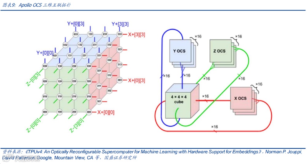 而光电路交换机(OCS, Optical Circuit Switching)技术,正是这场革命的核心引擎。传统电交换机需要进行光-电-光转换(O-E-O),导致微秒级的延迟和较高的能耗,OCS不同于传统交换机,可直接进行光路交换,无需做光电转换。通过全光路切换实现数据传输,同时配合3D环状的网络拓扑结构,有效降低了通信硬件成本和功耗。