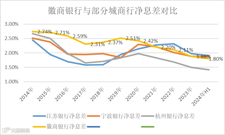 因此徽商银行作为省属最大金融企业,体量大,地位超然,竞争也相对较小。半年报数据显示,截至今年上半年,徽商银行在安徽省内存款市场份额为13.89%,贷款市场份额为10.56%,处于城商行中的高位。相比之下,业绩增速很高的杭州银行2023年在浙江省贷款余额的市占率为2.91%。