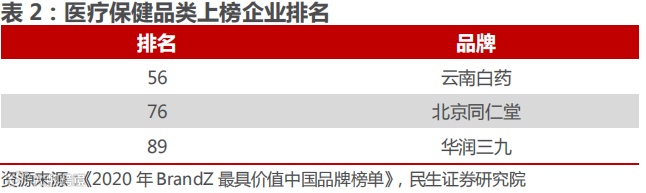 "999"品牌在消费者和医药行业中均享有较高的认可度,多次被评为“中国最高认知率商标”、“中国最有价值品牌”。在《2020年最有价值中国品牌100强》排行榜中,医疗保健领域共有3家企业入围,其中华润三九位列榜单第89位,品牌价值10.85亿美元。