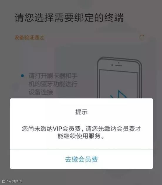 3、缴纳会员费:pos绑定成功后会提示缴纳会员费,点击“去缴会员费”,并在考拉超收设备上进行刷卡100元。点击“完成”即可。