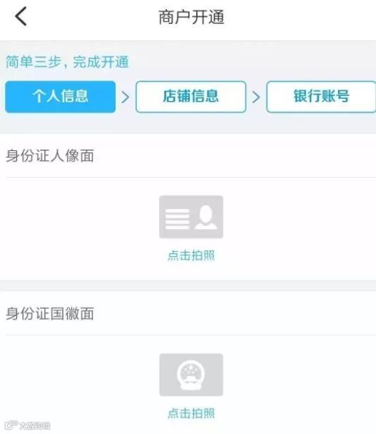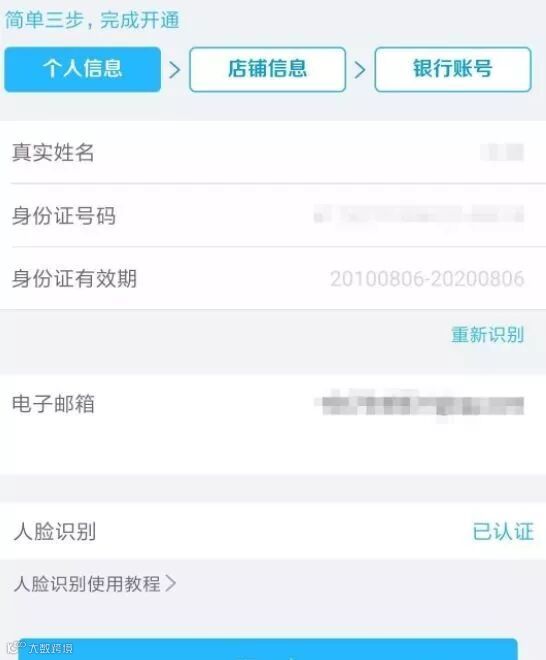 填信息提示:身份证照片+人脸识别+商户名称(名称可真可假随便填,例如:绵阳市星星百货商店)+邮箱号+地址(省/市/区自动定位,具体位置可真可假随便填,例如:东大街355号)+结算卡号(到账的银行卡,建议用主流大银行)