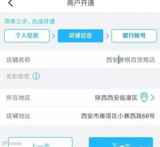 3、填写店铺信息:店铺名称不得少于7个字(随意填),地址填写本市地址即可。填写完后点击“下一步”。