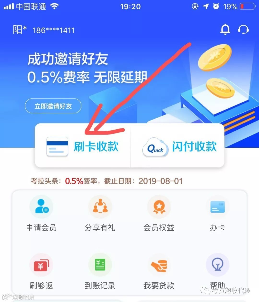 0.6%+3元/笔秒到(终端绑定缴纳会员费之日起享受30天VIP会员0.5%+3的费率;每成功邀请一个用户,可延长90天VIP费率,可以无限累计)