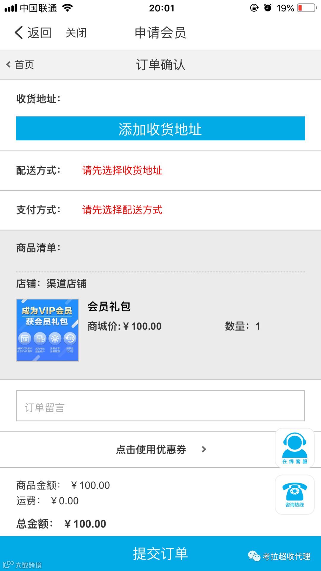 4、填写收货地址,缴纳押金费用(支付100元押金。客户收到机器绑定即可。不用再缴纳会员费)