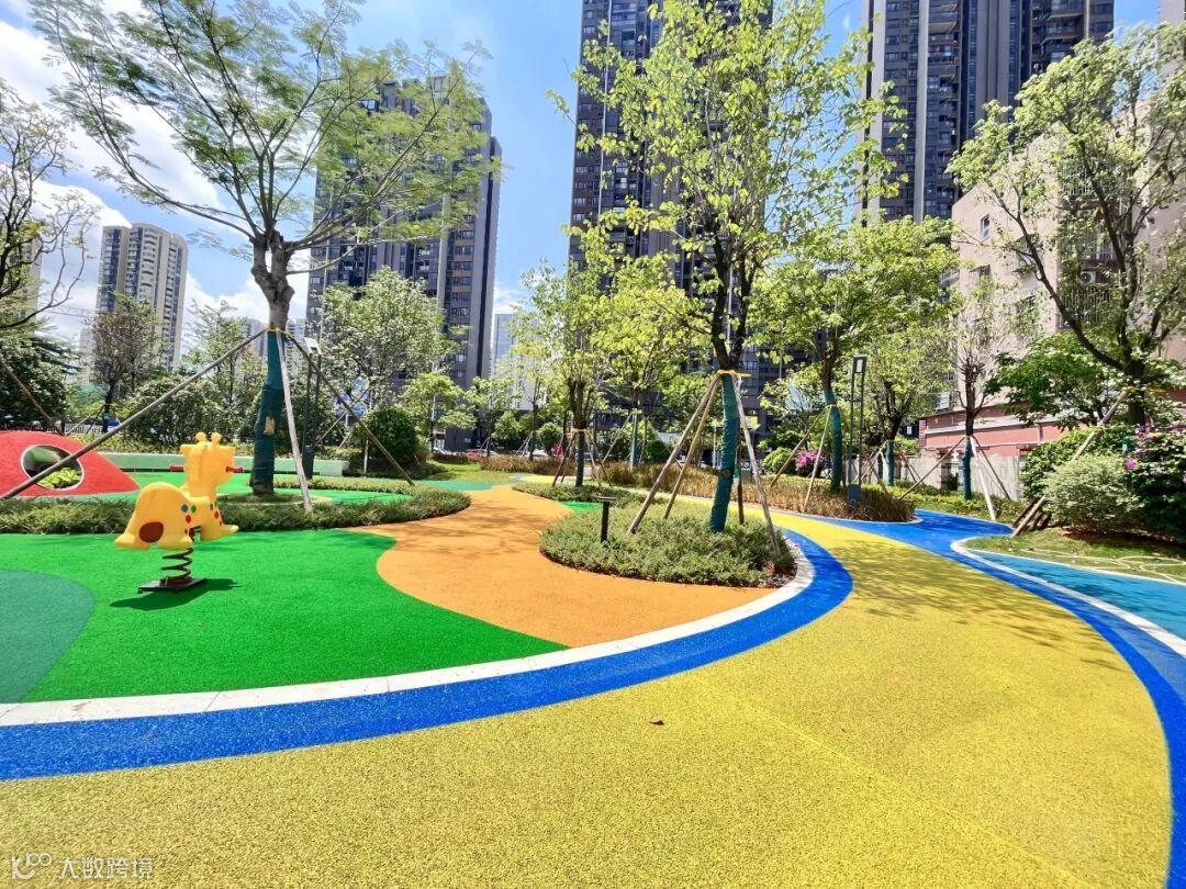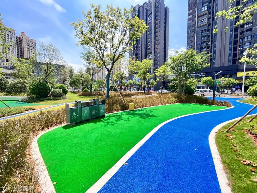 红橙黄绿青蓝紫,五彩斑斓的花朵装点着层叠错落的花镜,绿油油的草地犹如一层碧波,迎着夏日的美好,空气中飘散出阵阵幽香。项目建设过程中,筑平集团合理利用园内空间,种植了凤凰木、香樟、紫花风铃木等多个品种,树木与丰富花境、地被植物搭配成的舒适环境,让大家能在浓密树荫下休息、健身和交流。