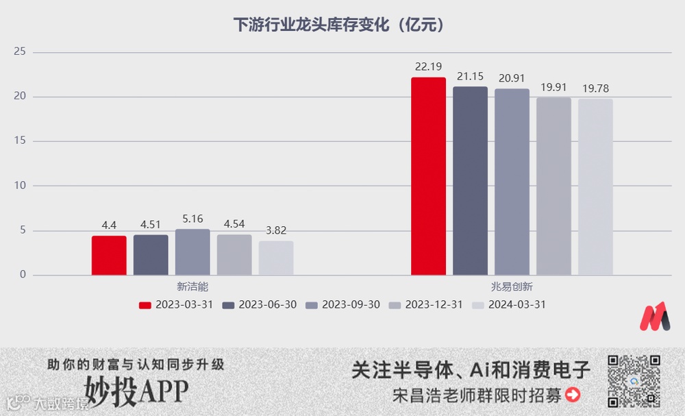 一方面,从华虹的下游市场来看,虽然整体需求暂时仍然相对疲软,但是其重要下游市场MCU行业和功率半导体的库存也都开始明显的松动,以行业内龙头公司新洁能、兆易创新为例,两家公司的库存较去年4季度相比出现了明显的拐点现象,下游库存压力进一步释放。