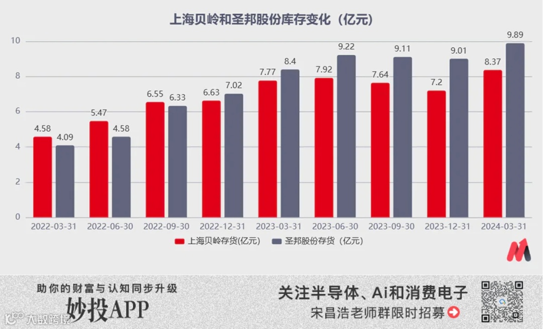 库存是反映的先行指标,模拟芯片行业的库存去化仍然缓慢。从上海贝岭的库存数据来看,2024年Q1公司的库存金额再次上升,达到了8.37亿元,同行业的龙头公司圣邦股份在一季度,库存水位同样进一步升高,接近10个亿,这意味着行业仍然去库存缓慢,尚未出现明显的回暖。