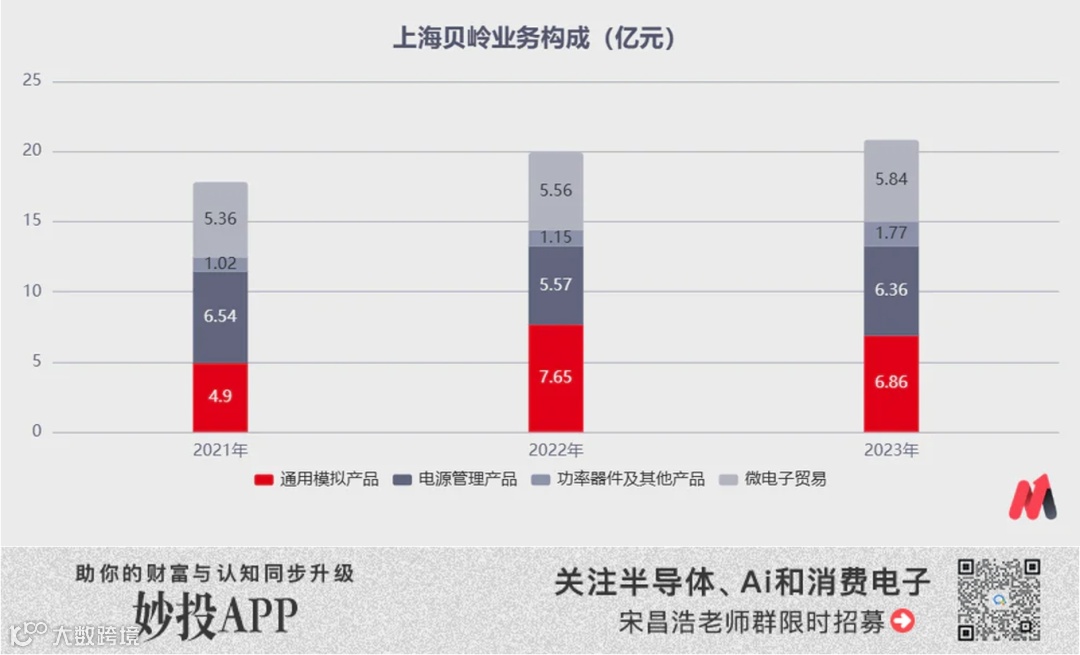 根据上海贝岭的2023年年报显示,当前公司的主要收入来自通用模拟类芯片、电源管理芯片、功率芯片以及微电子芯片贸易四大部分,其中模拟类芯片(包含通用模拟芯片、电源管理芯片)是公司的主要营收来源,约占到公司总营收的65%左右,也是市场对于公司最为关注的业务。