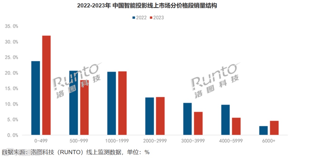 从数据上看,不仅仅是销量的下降,机型平均销售价格下降的更为明显。根据洛图科技(RUNTO)线上监测数据显示,2023年,中国智能投影线上市场均价为1756元,较2022年下降212元,降幅达到11%。