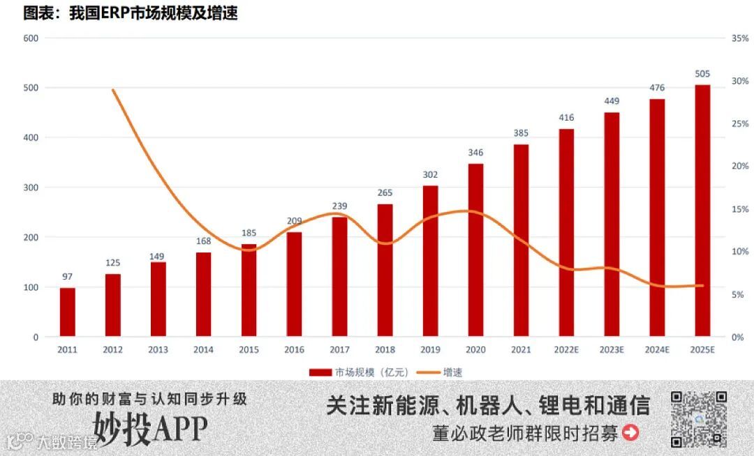 此外,国内ERP市场已经进入低速增长的时代。据前瞻产业研究院等机构预测,2025年我国ERP市场规模预计将达到505亿元,2022~2025年复合增速为7.0%。