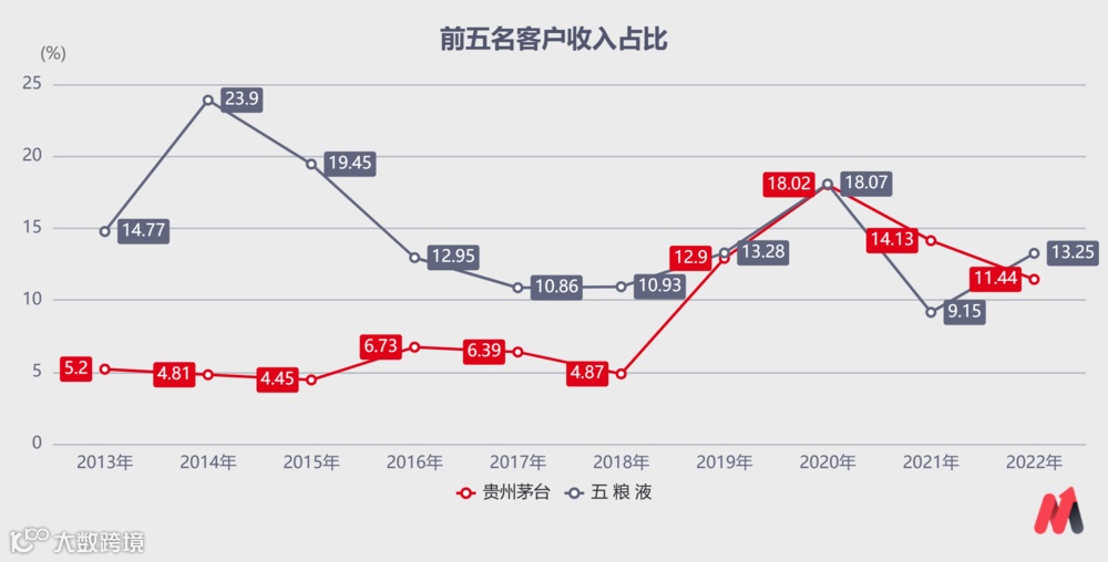 五粮液效仿茅台推行小商制,改革在2019年就已基本完成,对比其与茅台的前五名经销商营收占比,2020年二者均为18%,2021年五粮液为9.15%,茅台为14.13%;2022年五粮液比茅台高1.81个百分点。