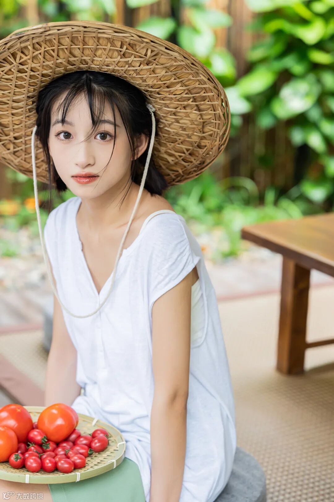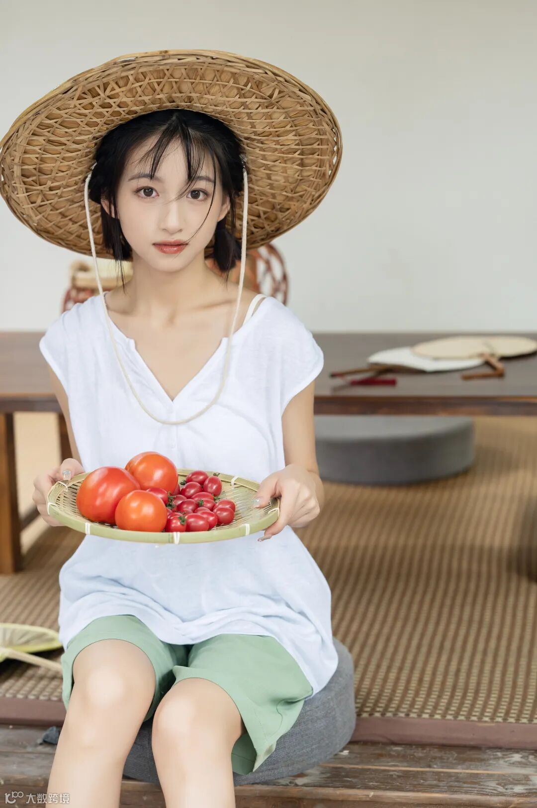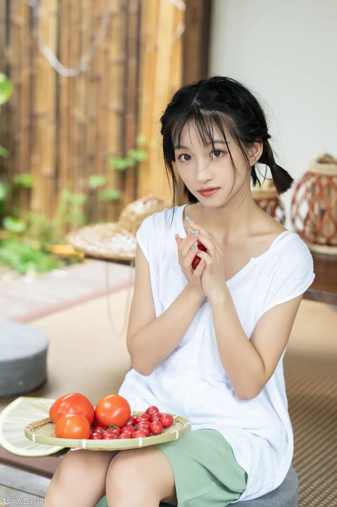 水果等道具可以放在模特身旁作为装饰点缀,或是放在腿上、端在手里。这时,我建议摄影师从较高的角度进行拍摄,让模特向上看镜头,收起下巴,露出水汪汪的大眼睛。