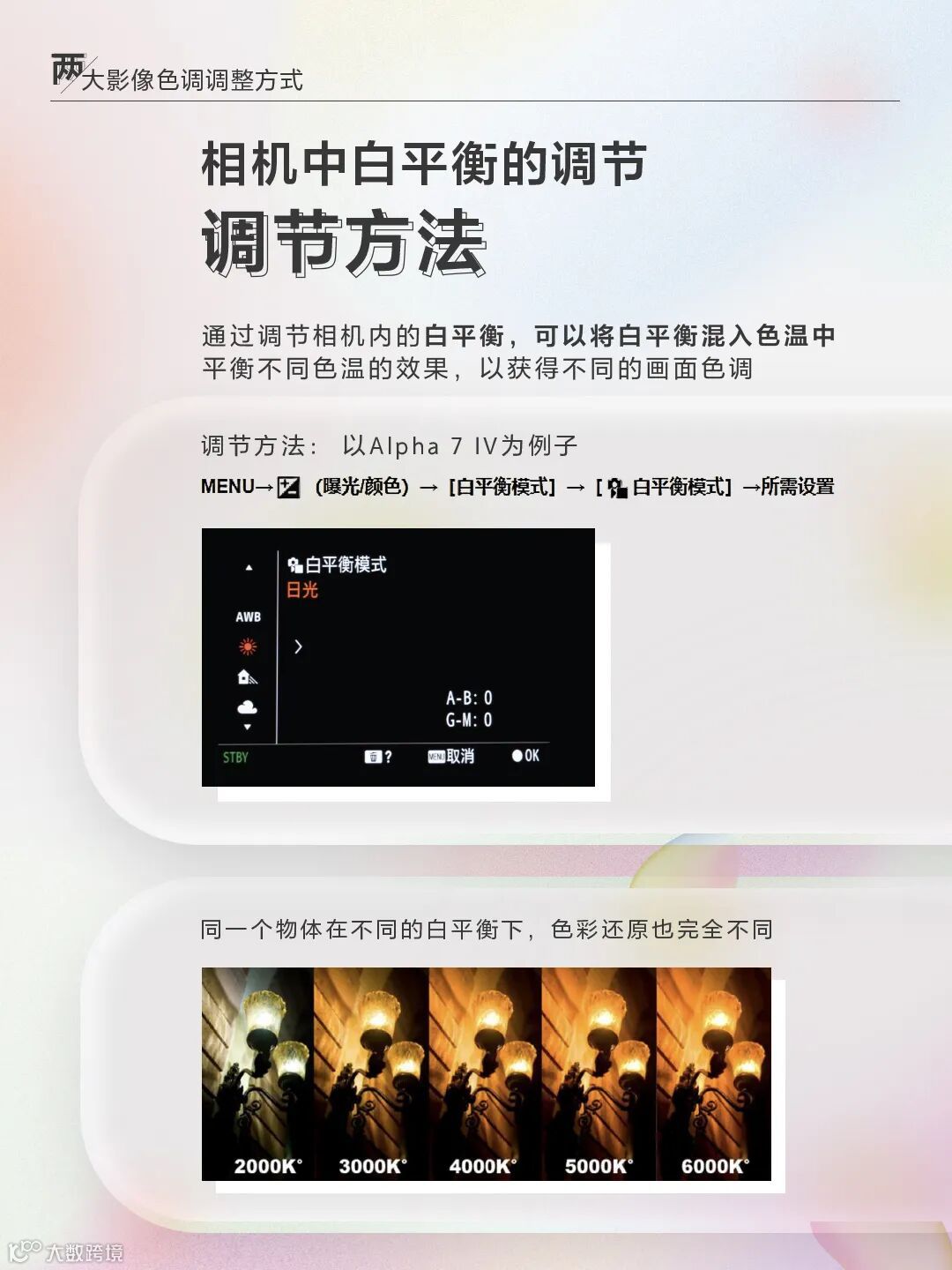拍摄时,在不同色温的光线下,物体会呈现不同的颜色,在冷暖色调之间用一个刻度来衡量,这就是“色温”,用“K值”表示,不同的色温给人不同的感受