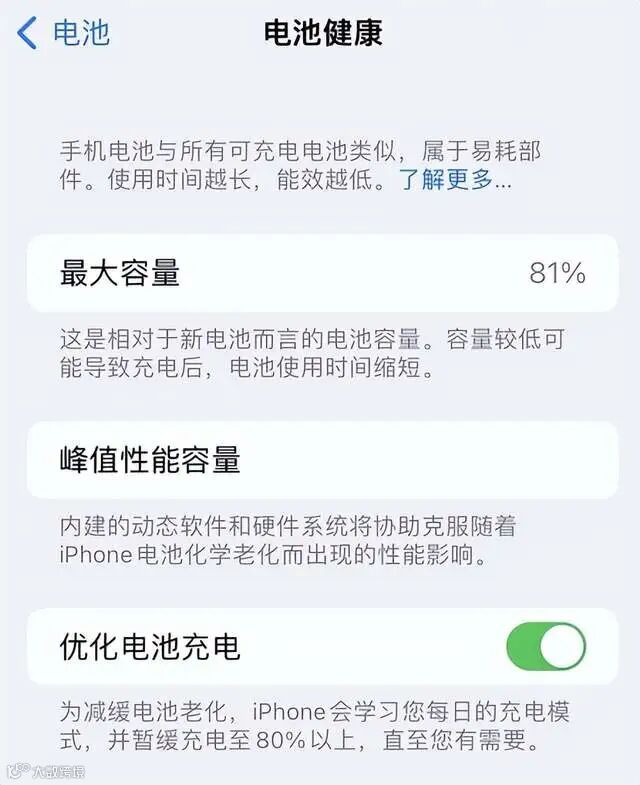 2. 开启优化充电功能,进入设置-电池-电池健康,开启优化电池充电。开启后当手机充电至80%时将会自动调整为涓流充电模式,充电速度变慢,保护电池;