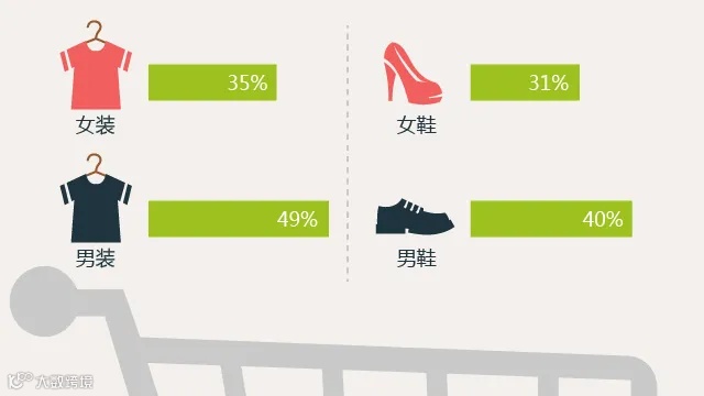 90后男生明显比90后女生更愿意在天猫上购买服装和鞋。在天猫上,男装的购买偏好为49%,女装为35%;男鞋的购物偏好为40%,女鞋为31%。
