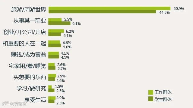 90后最渴望的事情是旅行,其中旅行愿望最为迫切的是工作中的90后,达50.9%,学生群体外出旅行的愿望为44.5%