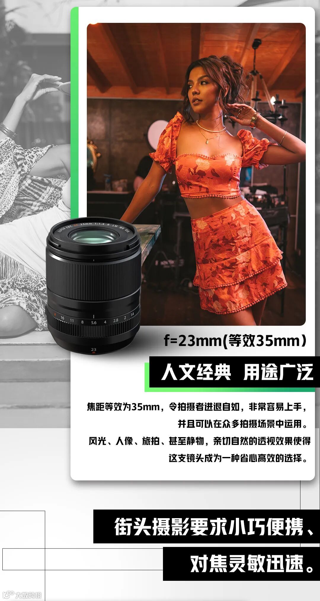 XF33mmF1.4 R LM WR(等效50mm)这个焦段不仅经典,而且在实际拍摄方面有众多优势。首先,50mm的透视效果和人的眼睛最接近,所以也被称之为标头,是一个非常容易上手的焦段。