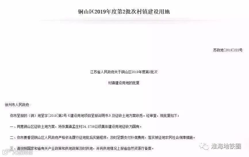 而在五一前,省政府已批复铜山区2019年度第2批次村镇建设用地,将张集镇孟庄村34.5756公顷集体建设用地征收为国有。