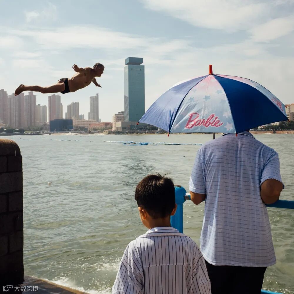 大众摄影:颇有决定性瞬间的意味,远近人物之间,人物与背景建筑之间的对比也很好。稍显可惜的是右侧伞下的人没有露全脑袋,看起来略感别扭,而跳水的人也有点靠近画面边缘了。