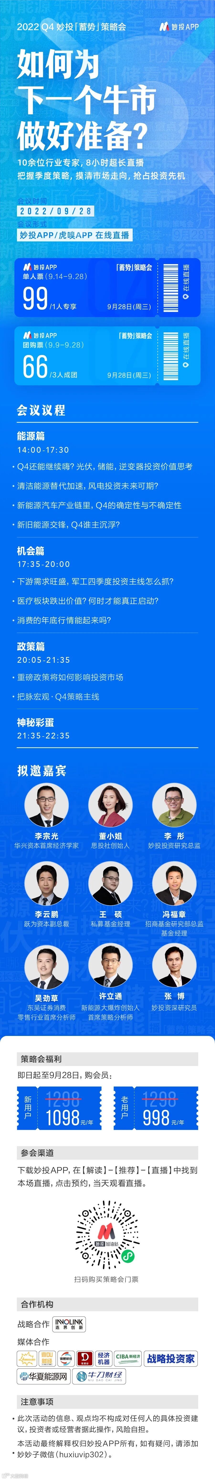 妙投Q4季度「蓄势」策略会即将开始,下周三(9月28日)下午两点,10余位行业专家,8小时超长直播,把脉宏观、分析赛道、拆解公司,全程高密度输出,为投资者打包整季投资要点。