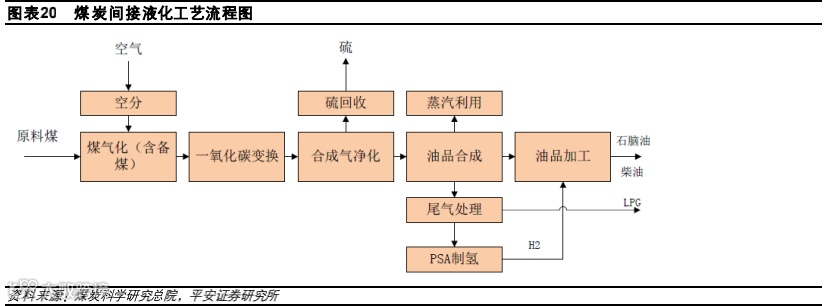 煤炭液化:煤制油包括煤直接液化和煤间接液化。煤直接液化,又称煤加氢液化,是指煤炭在高压、高温、加氢的条件下,经催化剂的作用,进行加氢反应,直接转化为液态产物的工艺技术。煤的间接液化技术是先将煤气化成合成气。然后以煤基合成气为原料,在一定温度和压力下,将其催化合成为烃类燃料油及化工原料和产品的工艺。