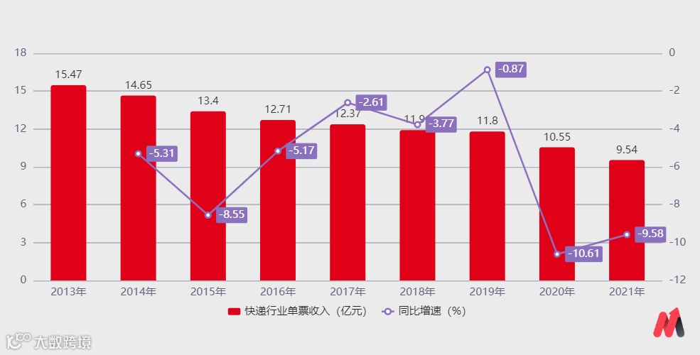 2021年,受价格战影响,快递行业单票收入为9.54元/件,同比下降9.58%,这也是快递行业业务收入增速远低于业务量增速的主因。