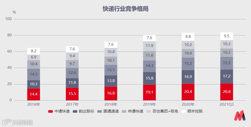 自2016年起,中通稳坐快递行业第一的宝座,但由于不具备差异化竞争优势,其与后来者尚未拉开较大差距。为了抢占更大的市场份额,中通于2019年主动发起价格战。自此,快递行业开始进入快速整合期,中小企业加速出清。