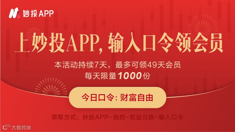 【新春福利】新年新气象,股市涨不停;过年7天乐,好礼送不停。除夕至大年初六,每天在妙投APP上输入口令,即可免费兑换7天会员,最多可免费领取49天会员。今日口令为「财富自由」,手慢无,快去领取吧。(Tips:每天的口令不一样~记得每天来查看新的口令)