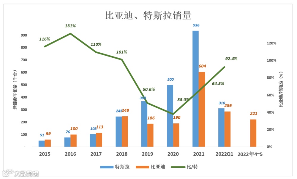 2021年,比亚迪新能源车销量暴涨218%、超过60万台,相当于特斯拉的64.5%;2022年Q1,比亚迪交付28.6万台、相当于特斯拉的92.4%。