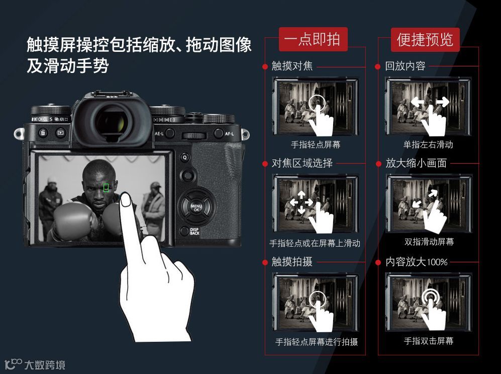 在这块可翻折的触摸屏上,依靠手指点触、拖拽即可完成大部分操作。不仅快捷高效,而且可以让不熟悉相机操作的新手快速掌握相机的使用方法。
