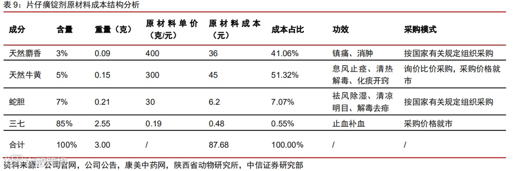 我们以天然麝香收购价400元/克、天然牛黄300元/克、蛇胆30元/克、三七0.19元/克,对片仔癀锭剂的原材料成本进行估算。天然麝香和牛黄虽只占其总重量的3%和5%,但两者占总成本的比值超过92%,分别为41.06%和51.32%。