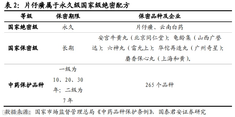 片仔癀为国家绝密级配方,产品护城河深厚。国家绝密级配方保密期限为永久,目前只有两个配方(云南白药和片仔癀)纳入。同时,片仔癀也是国家一级中药保护品种,其传统制作技艺被列入国家非遗名录。