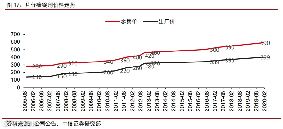 由于供不应求的局面持续,“片仔癀”系列自公司上市以来多次提价。以核心产品片仔癀锭剂为价格标杆,其零售价从2005年的280元/粒提升到2020年的590元/粒,CAGR为5.09%;出厂价缓慢提价,2014-2020年CAGR为3.75%。