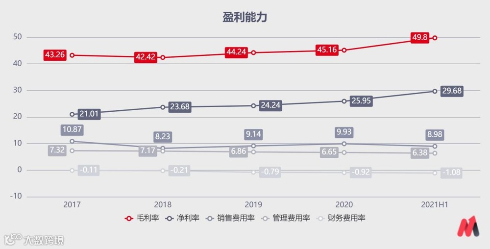 而公司产品的稀缺性保证了公司在获取高毛利的同时,能较好地控制销售费用和管理费用。得益于期间费用的良好控制,公司的净利率在2021H1提升到了29.68%的高位水平。