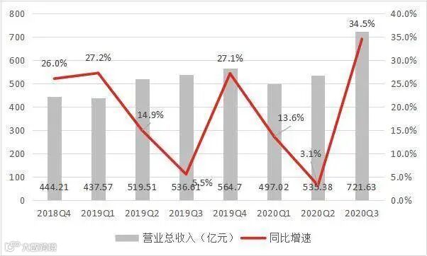 2020年,11月24日,小米集团如期发布三季度财报,期内公司实现营收722亿元,同比增长34.5%,环比增长34.8%,远超市场此前给出的680亿元的预期;同期调整后净利润为41.28亿元,同比增长18.9%,环比增长22.4%。