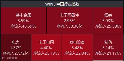 接下来我们就来聊一下今天的板块行情。Wind数据显示,基本金属、电子元器件、酒类等板块今天资金流入居前。我们前几天一直在关注的医药板块今天的表现也非常好。