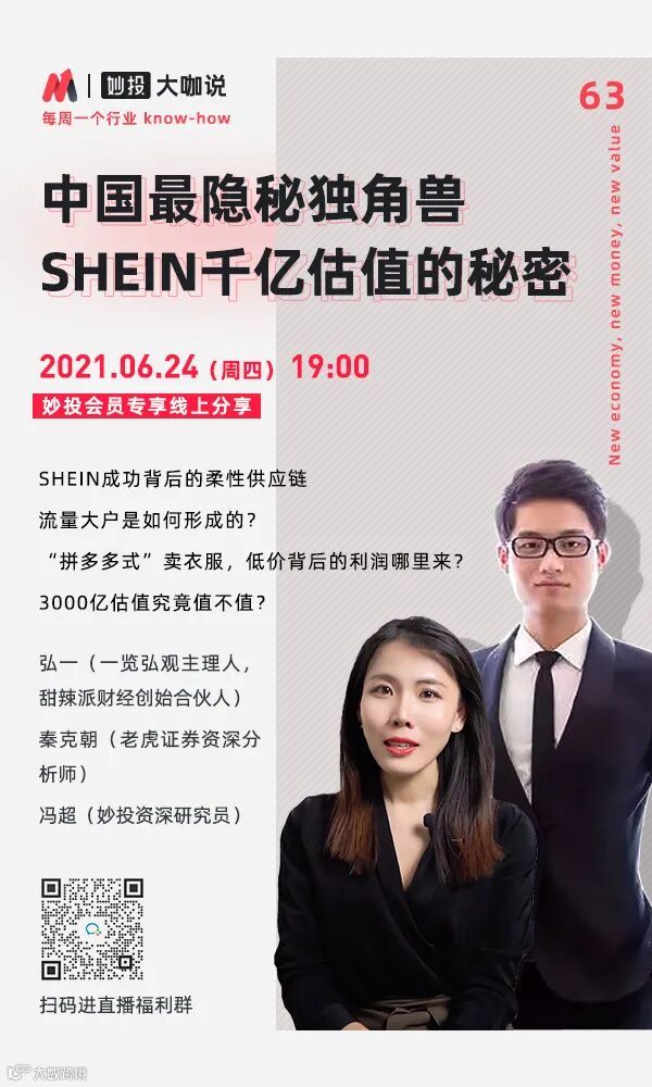 对啦,6月24日(本周四)晚上7点,一览宏观主理人弘一、老虎证券分析师秦克朝和妙投研究员冯超,带你一起解析中国最隐秘独角兽SHEIN千亿估值的秘密,欢迎各位小伙伴来直播间玩耍呀~扫描下图二维码即可加入妙投直播福利群享受更多权益。