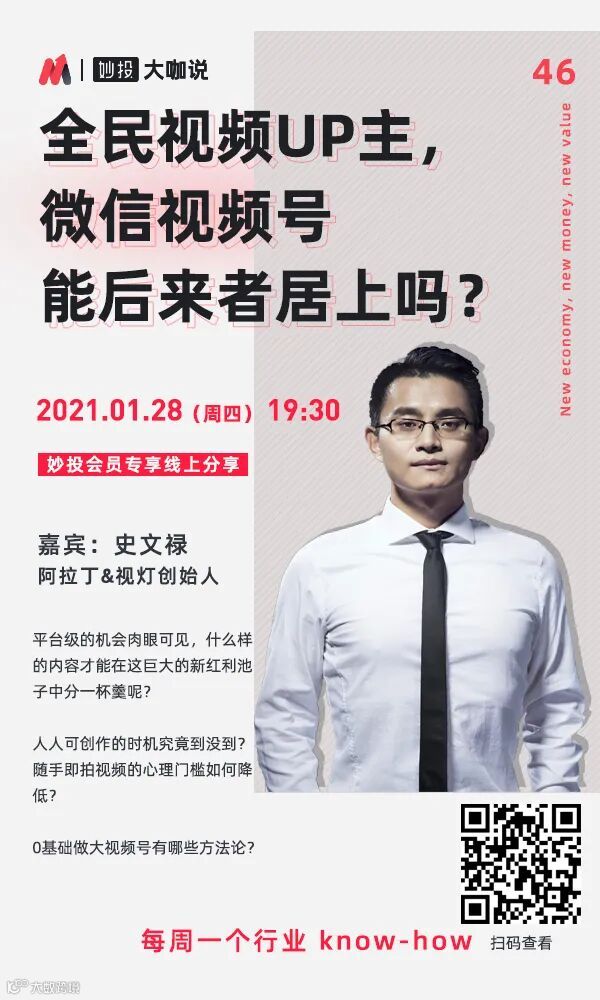 如果你对微信视频号感兴趣,想要知道平台级的机会肉眼可见,什么样的内容才能在这巨大的新红利池子中分一杯羹呢?想了解视频号、抖音、快手、B站等平台做短视频有哪些优劣势?0基础如何做大视频号?那么,不妨来妙投「大咖说」直播间看看。