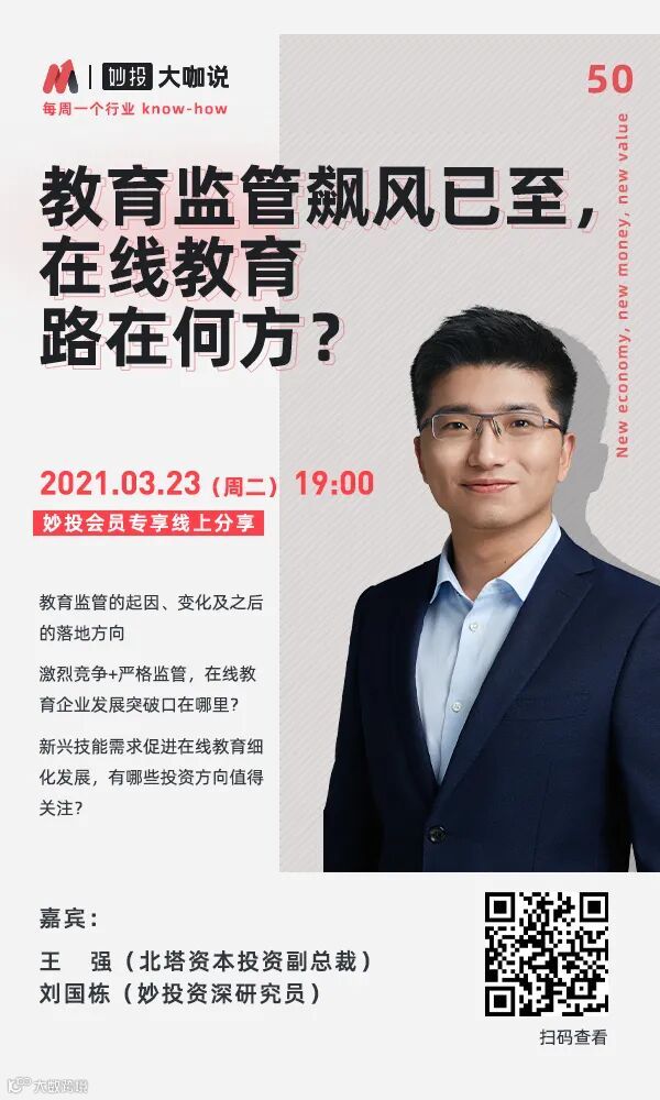 哦对了,本周二晚上七点,中国领先的教育行业风险投资机构“北塔资本”的投资副总裁-王强将莅临妙投直播间,谈一谈教育监管飙风下,在线教育路在何方?欢迎各位小伙伴来直播间提问留言~