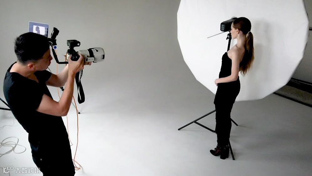 首先把ISO降低,闪光灯输出调高,这样出来的背景会白白的,但是模特就会暗下来。这里有个技巧就是把灯放在模特的五官周围,不仅会形成剪影,部分光线打到模特的苹果肌上突出五官和轮廓,这种布光会很受女生喜爱。
