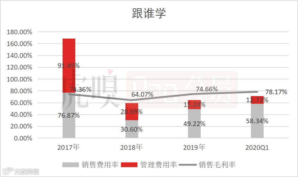 2017年,跟谁学的经营费用率处于高位,销售费用率和管理费用率(包含研发费用率)累计168.36%,意味着当期的营收无法覆盖费用支出,经营亏损是必然的。