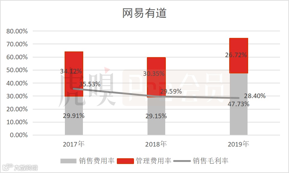 首先,网易有道虽然背靠网易,但网易并不像新东方在教培行业中的品牌影响力,导致网易有道在市场竞争激烈,获客趋难下,依然需要不断加大市场费用的投入来获客,使其销售费用率从2017年的29.91%提升至2019年47.73%,逐渐失控,大大压缩了平台的盈利空间。