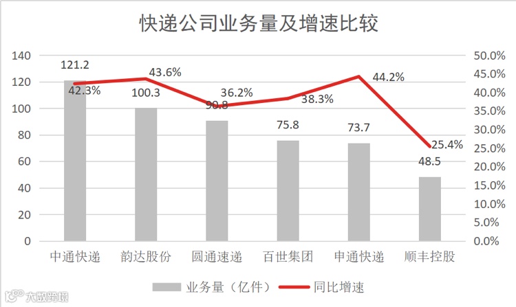 1. 规模方面,中通业务量、市占率均稳居通达系之首。