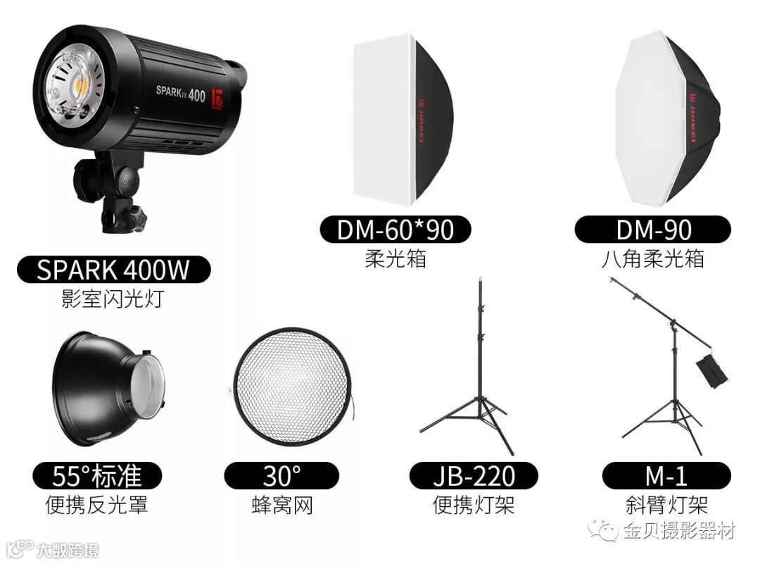 ③为1盏SPARK 400W影室闪光灯,加上DM-60*90柔光箱作为补充光;位置在主灯右下方。用来提亮暗部阴影,增加暗部细节;提升照片整体质感。