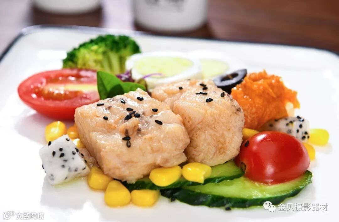 ②为1盏SPARK 400W影室闪光灯,附加55°便携标准罩+蜂窝网;位置在食物左侧做轮廓光,向下倾斜45°照射。硬光罩打光勾勒食物的轮廓,让食物更有光泽感、立体感;看起来更有食欲。