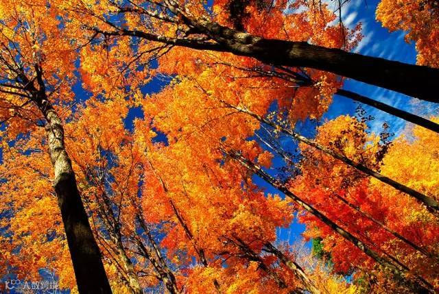 秋天的天空特别清爽明朗,晴朗的蓝天与叶子的颜色形成强烈反差,可以使叶子看上去更加艳丽。
