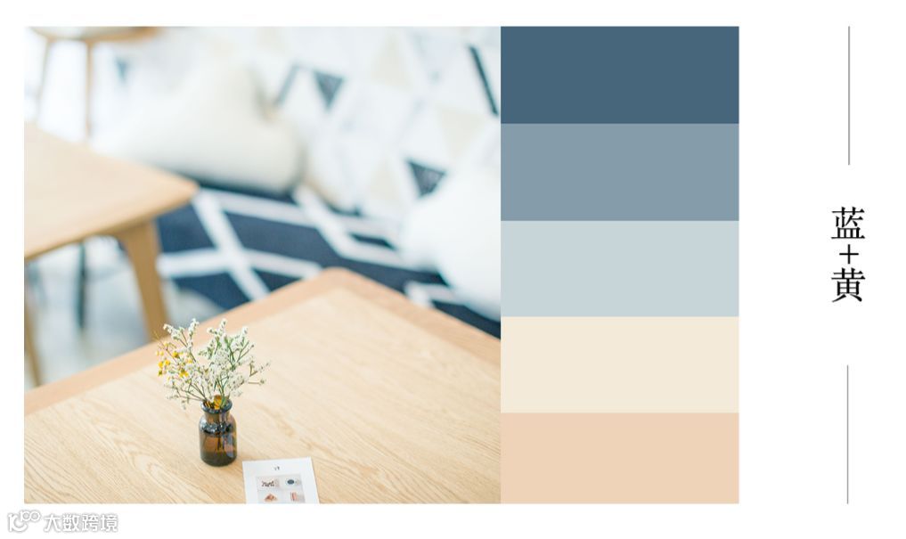 冷色的蓝加上暖色的黄,比较适合一些室内的家居拍摄和咖啡店,不过也不局限在室内,如在室外的蓝天加上黄色的柠檬黄或是其他类似的蓝黄搭配。