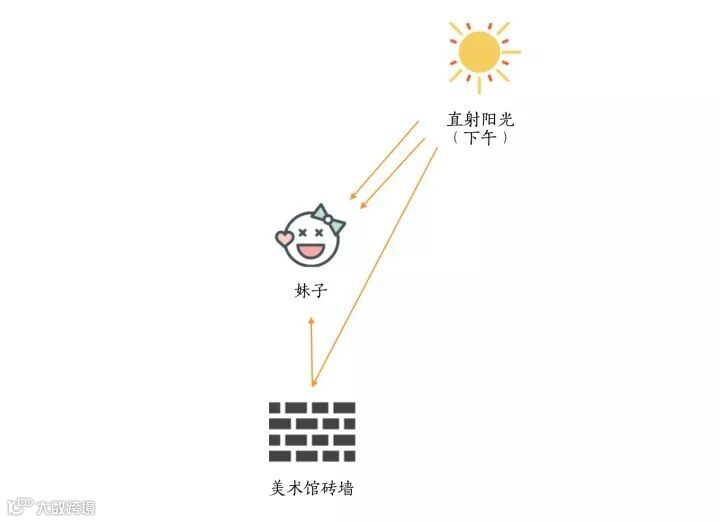 如果距离墙体太远,妹子脸部的光线可能会出现明暗差距过大的情况。